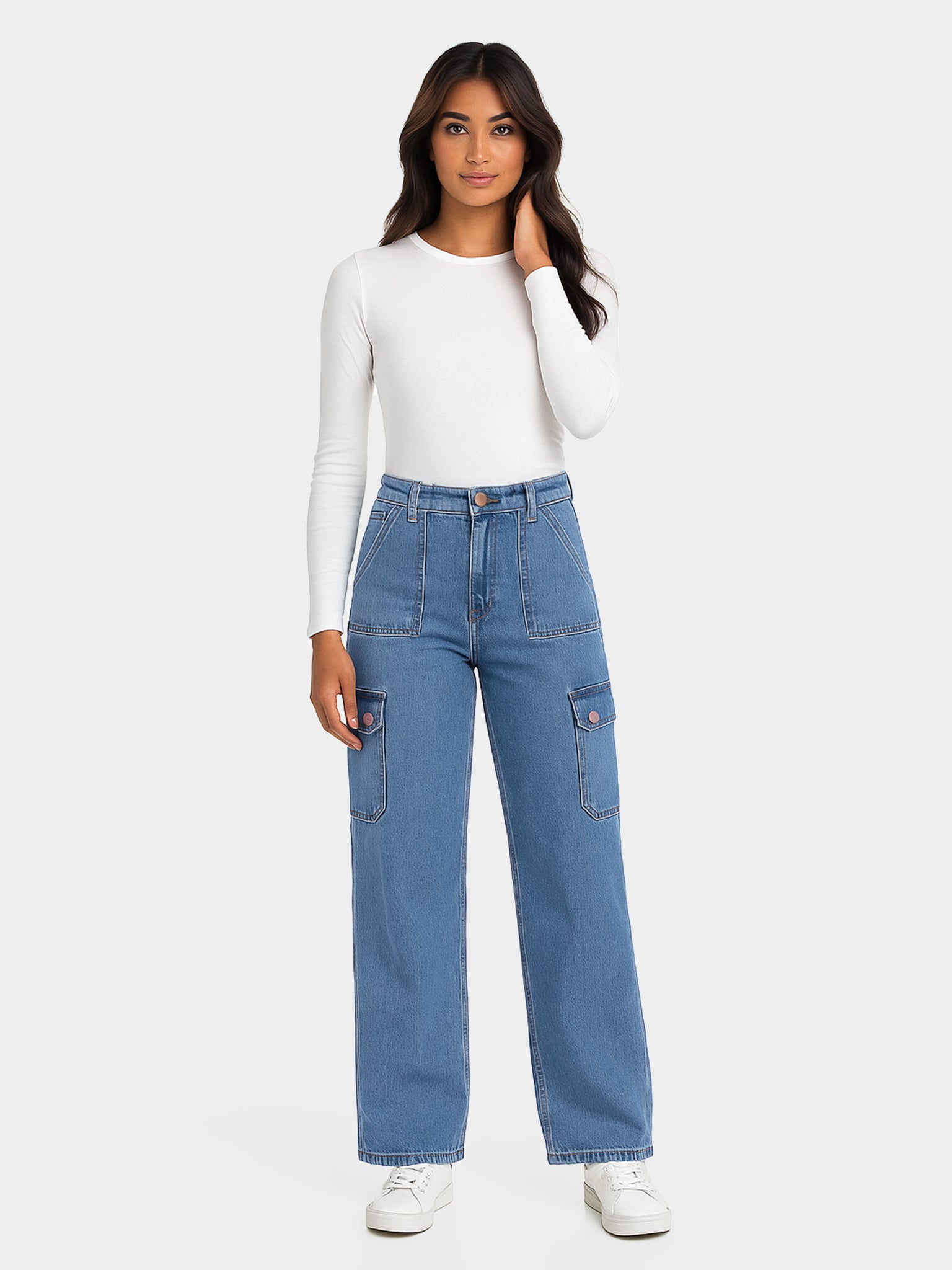 Ce jean taille haute ERIKA CARGO est offert dans une teinte bleu moyen délavé avec coutures dorées. Ce pantalon à jambe large est légèrement plus court pour un look actuel et tendance.